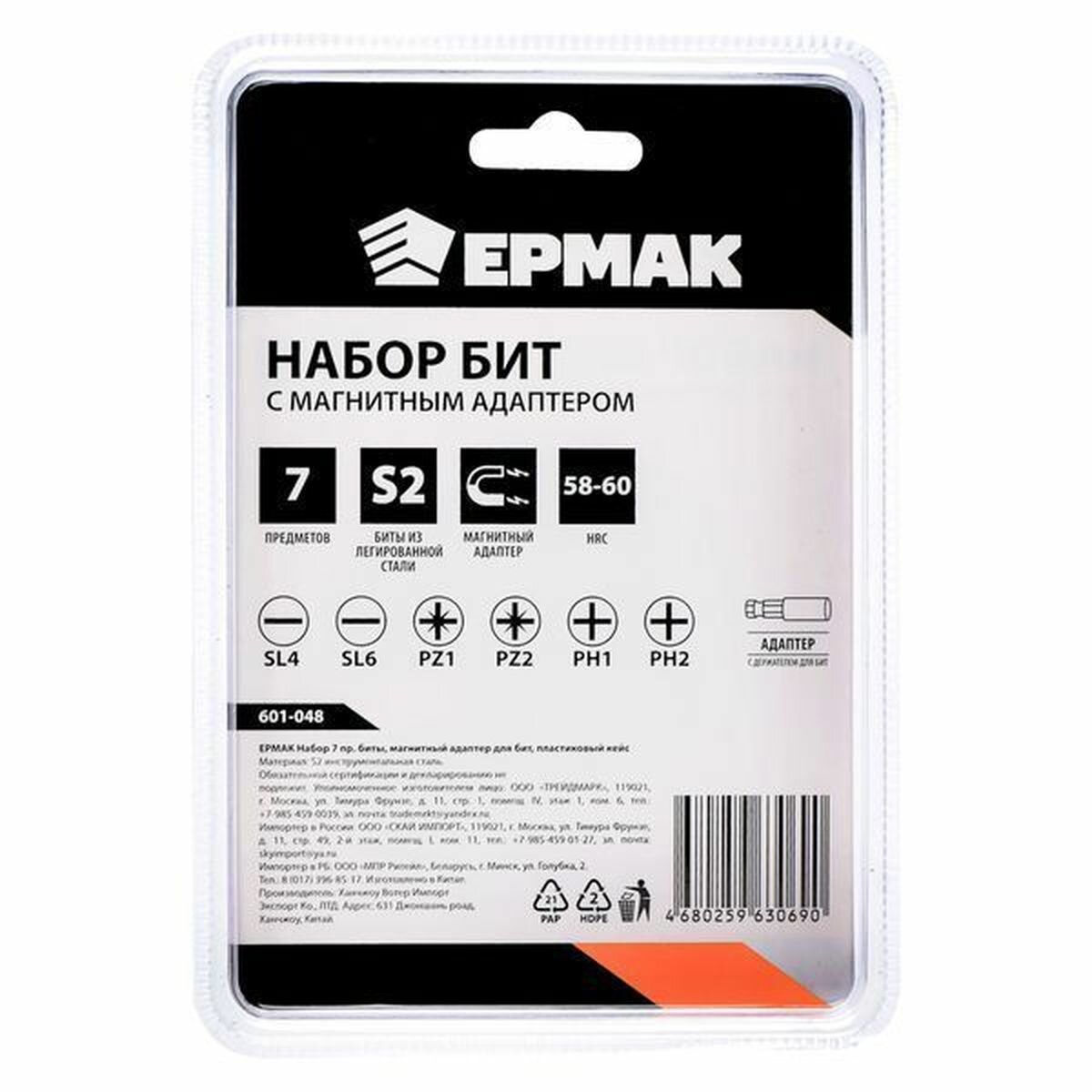Биты для шуруповерта Ермак с магнитным адаптером, набор 7 предметов, пластиковый кейс, длина 25 мм, в наборе PH,PZ,SL, легированная сталь S2