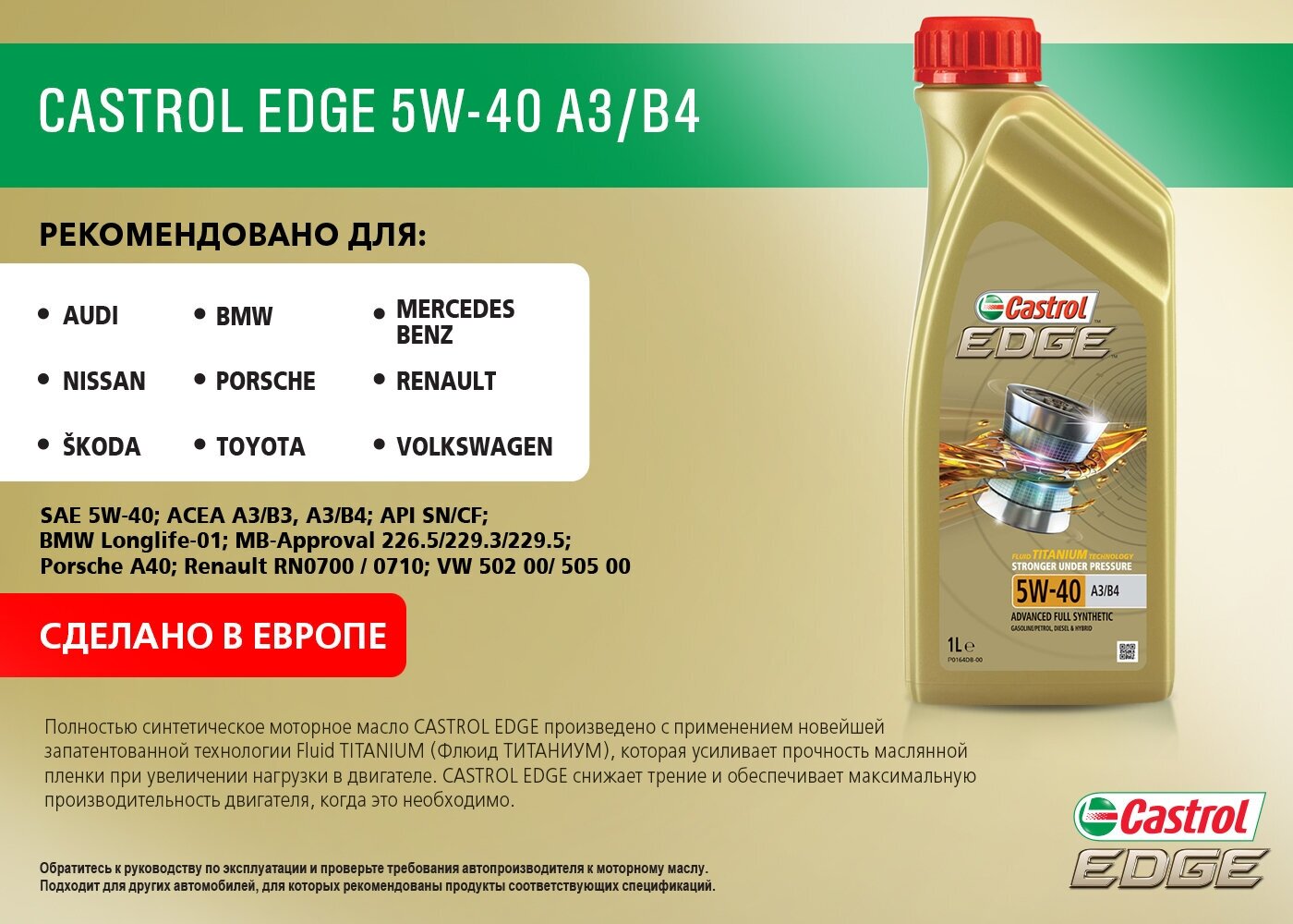 Castrol Масло Edge 5W-40 A3/B4 1Л Sn/Cf Bmw Longlife-01 Mb 226.5/229.3/229.5 Porsche A40 Renault Rn0700/Rn07