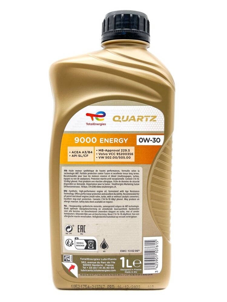 TOTALENERGIES 213767 Масло моторное синтетическое QUARTZ 9000 ENERGY 0W30 API SL/CF, ACEA A3/B4 1л