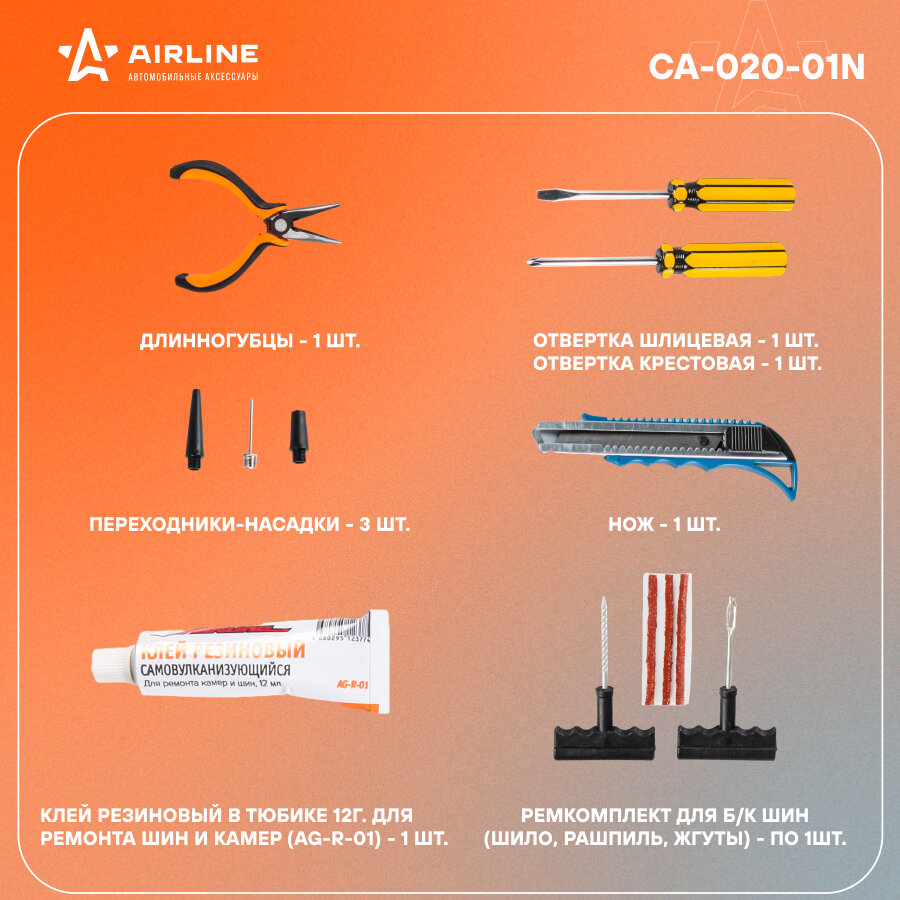 AIRLINE CA02001N CA-020-01N_компрессор! TORNADO S с кмпл инстр. в кейсе (2отверт., ремкомп.б/к шин, нож, плоcкогуб.)\ 1шт