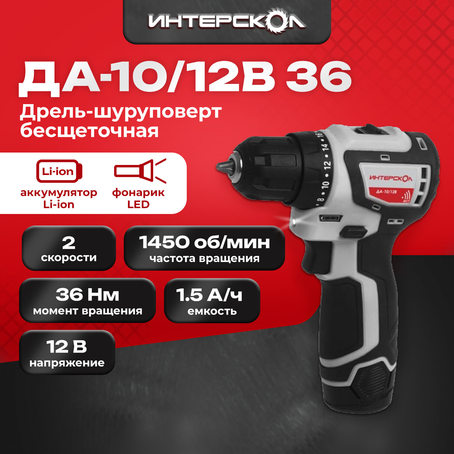 Аккумуляторная дрель-шуруповерт бесщеточная ИНТЕРСКОЛ ДА-10/12В (Li-ion, 2 аккум., 1,5Ач) в коробке