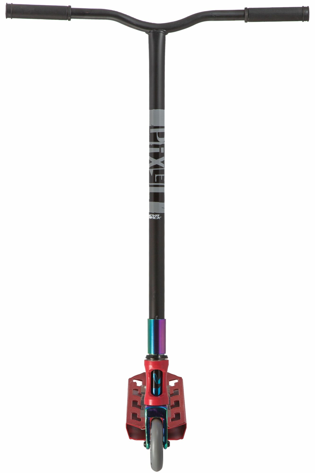 Самокат трюковый NOVATRACK PIXEL PRO BL, PU колеса 110 мм с алюмин.ободом, зажим 4 болта цвет неохром, хроммолибденовый стальной удлиненный Y-руль с размером грипс 130мм, алюмин.вилка цвет неохром, пром.подшипник, красный