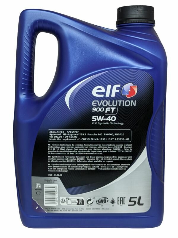 ELF 213917 5L Масло ELF EVOLUTION 900 FT 5W40 A3/B4 SN/CF VW502/50500 BMW LL-01 MB 229.5 RN0700/RN0710 PORSCHE