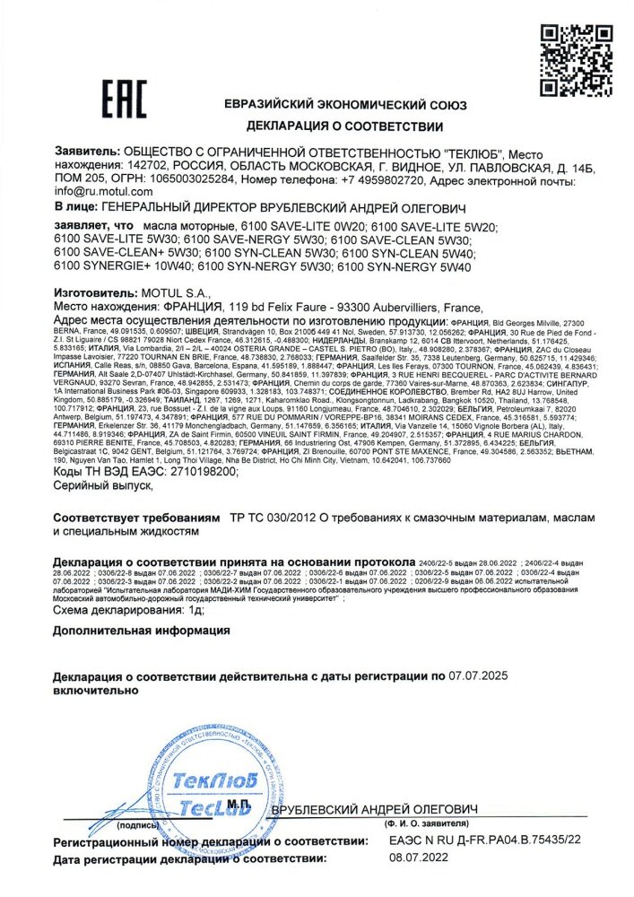 MOTUL 107952 MOTUL 6100 SAVE-NERGY 5W30 Масло моторное синт. 1л