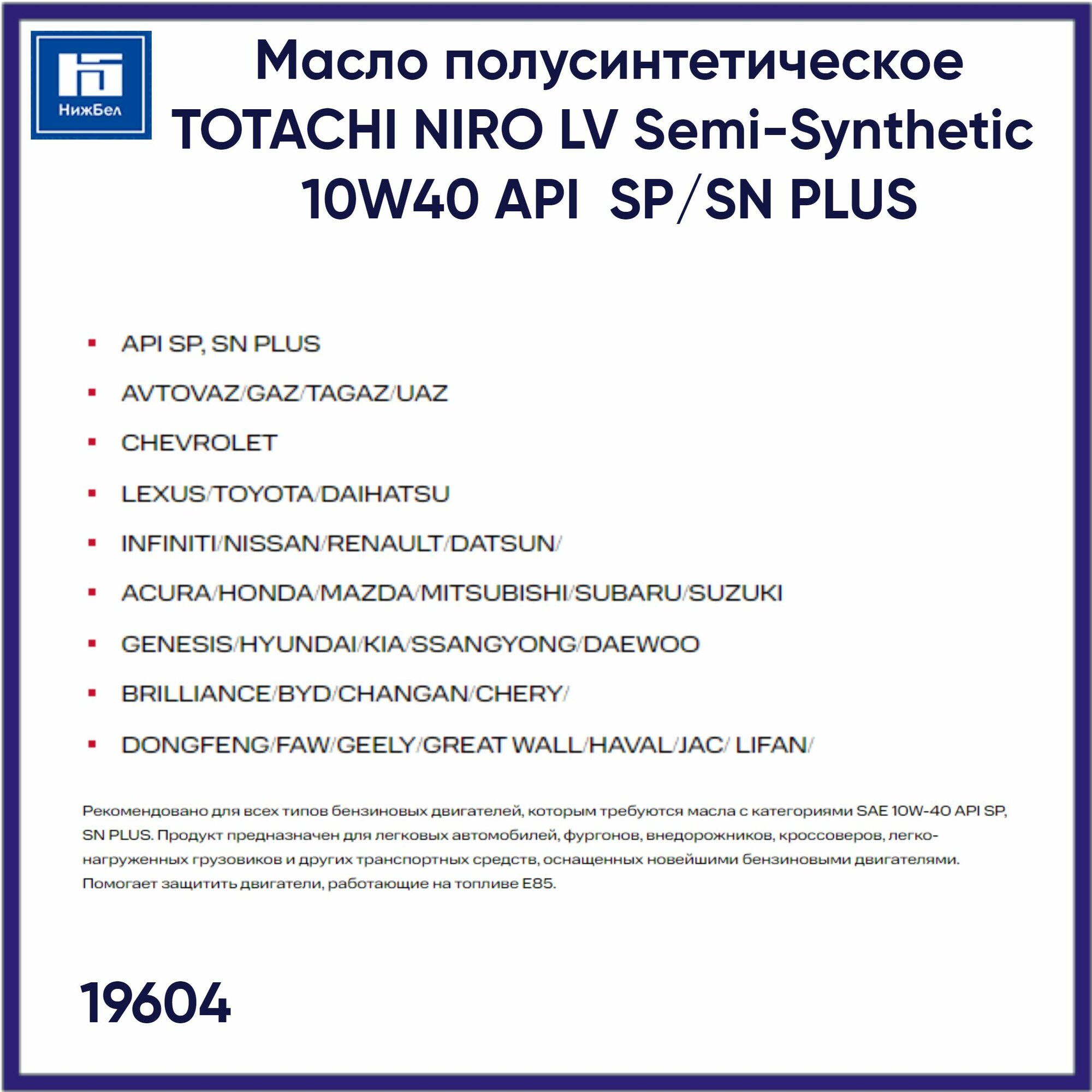 TOTACHI 19620 TOTACHI NIRO LV 10W40 (19L)_масло моторн.! полусинт.\API SP, AVTOVAZ