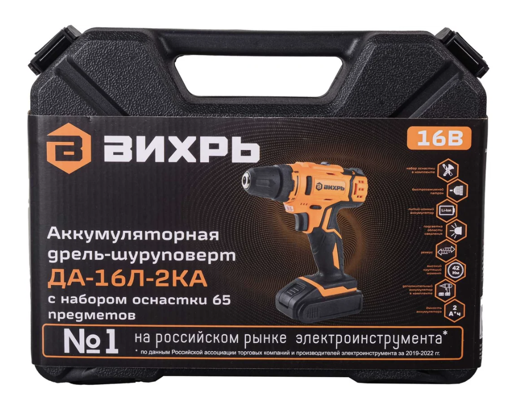 Дрель-шуруповерт аккумуляторная Вихрь ДА-16Л-2КА с набором оснастки 65 предметов