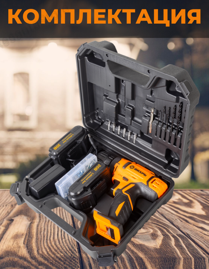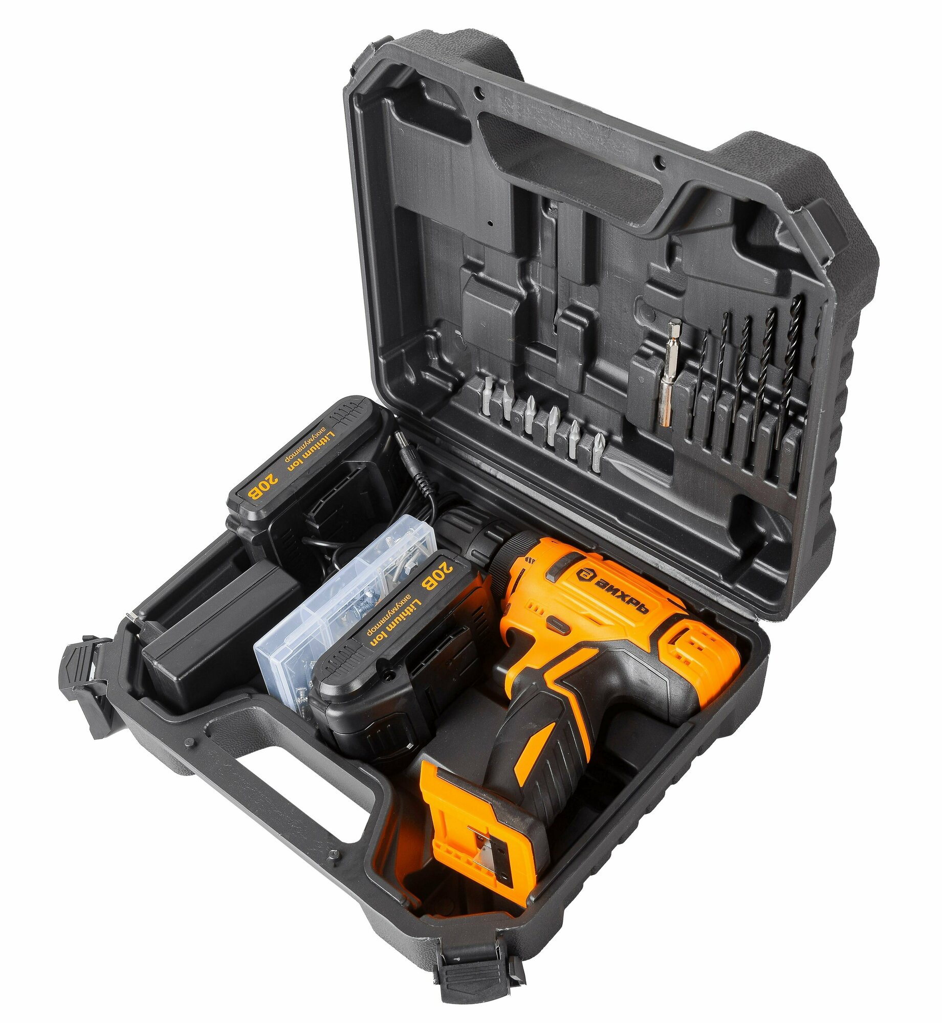 Аккумуляторная дрель-шуруповерт Вихрь ДА-20Л-2КА с набором оснастки, 65 предметов
