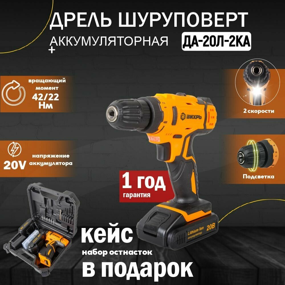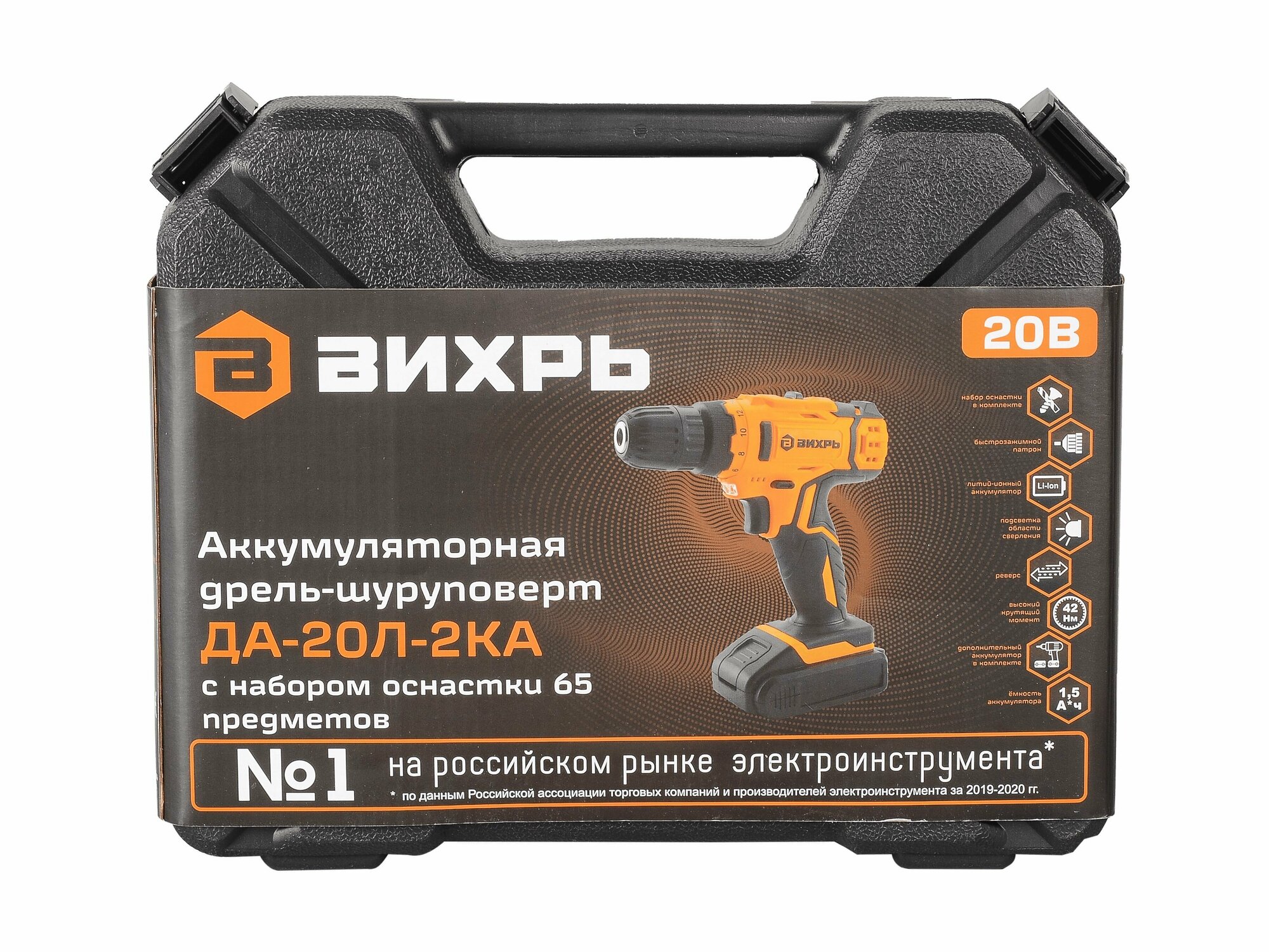 Аккумуляторная дрель-шуруповерт Вихрь ДА-20Л-2КА с набором оснастки 65 предметов (72/14/36)