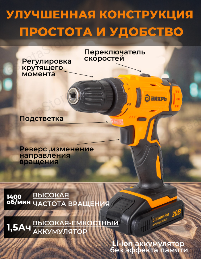 Шуруповерт аккумуляторный Вихрь (14.4 В, 40/20 Нм, быстрозажимной, 400-1400 об/мин, 2 А/ч, 1.25 кг)/Дрель-шуруповерт ДА-14,4Л-2