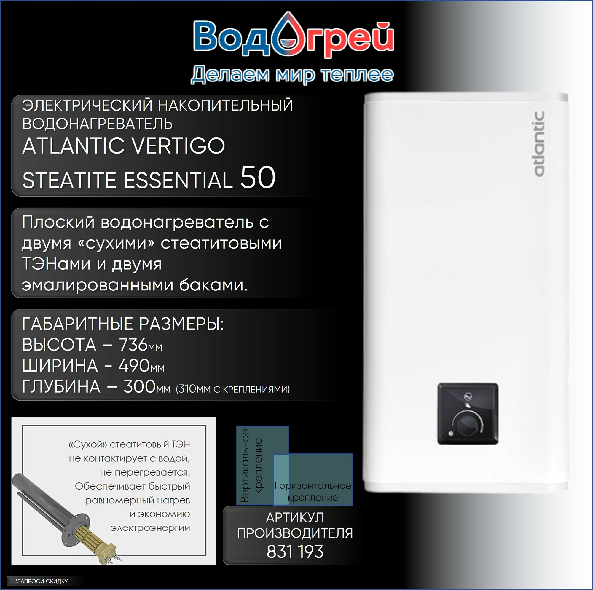 Водонагреватель плоский Atlantic VERTIGO STEATITE 50 E, 40л(сухой ТЭН)