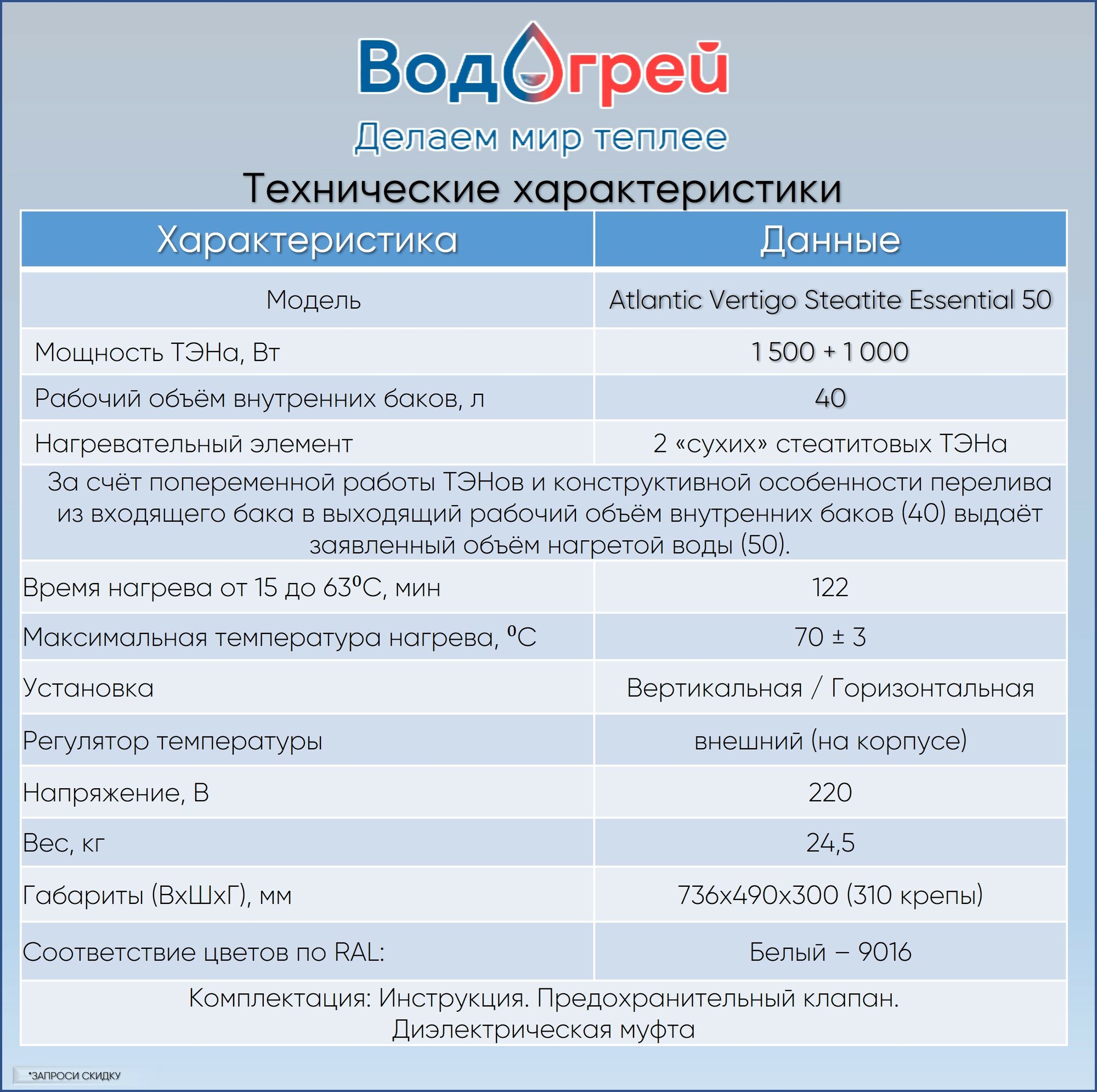 Водонагреватель Atlantic Vertigo Steatite Essential 50 (40 литров 1,5кВт+1кВт)