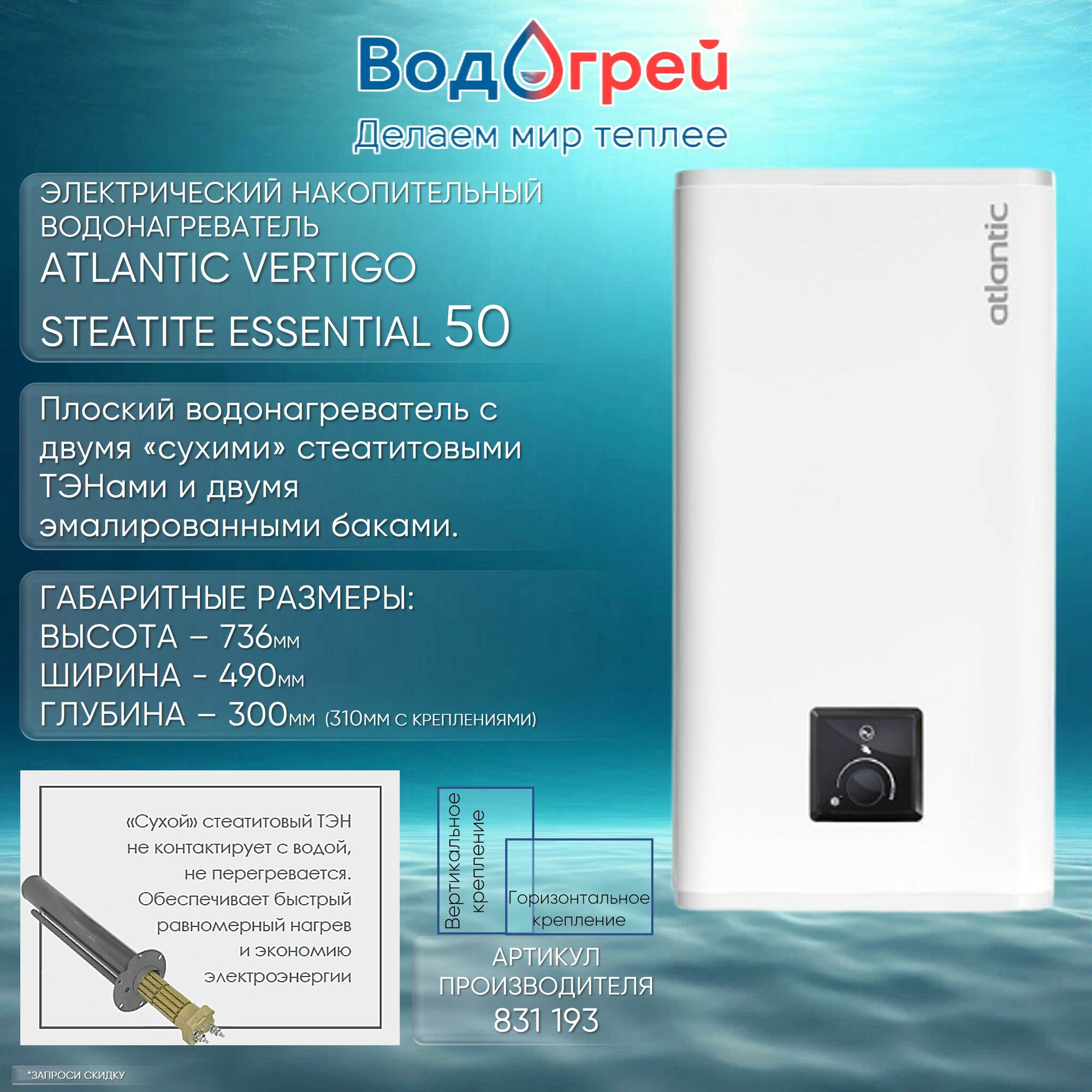 Электрический водонагреватель Atlantic Vertigo Steatite ESSENTIAL 50 831193