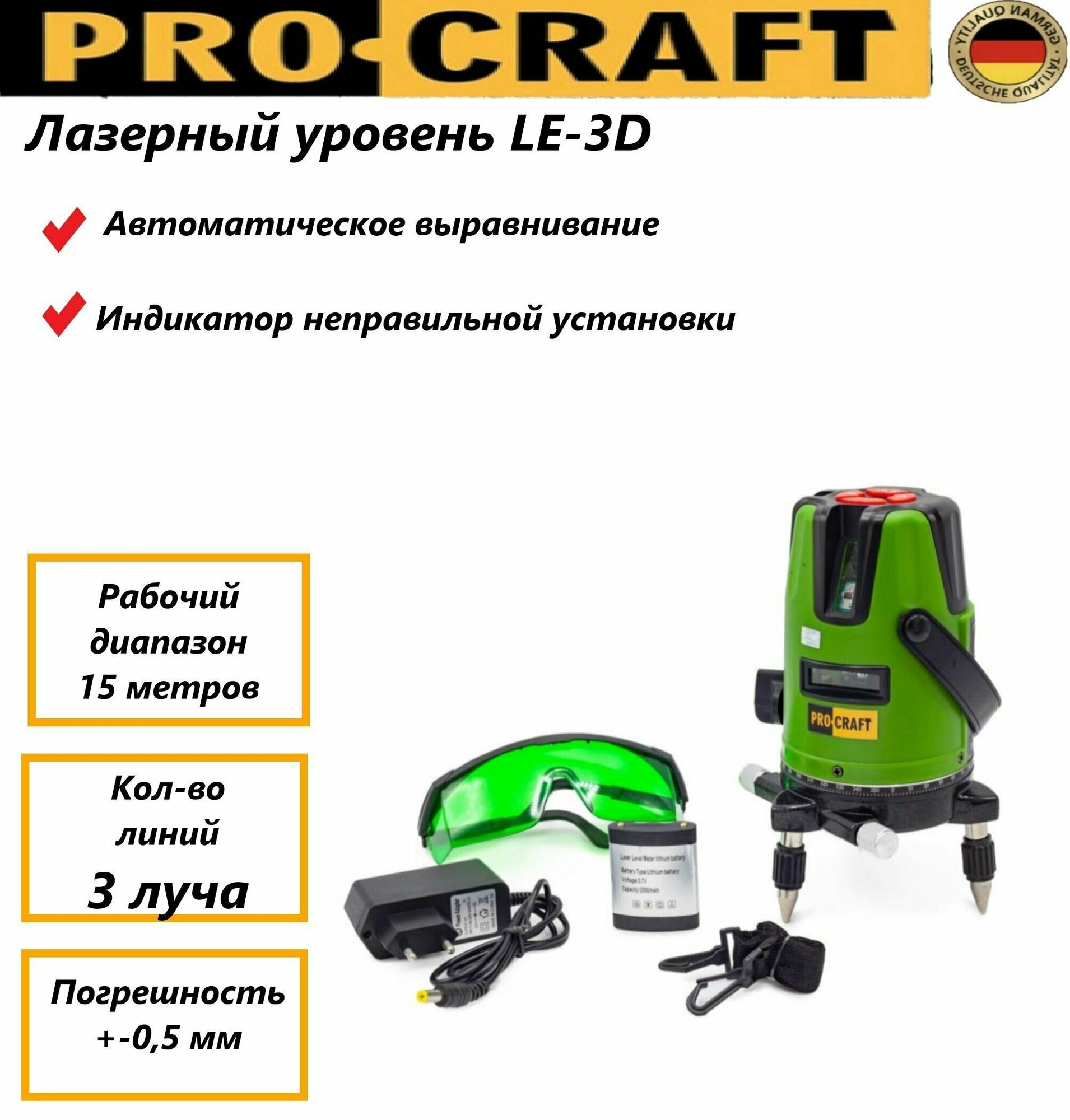 Купить Лазерный уровень, нивелир Pro-Craft Professional LE-3D, 3 линии луча, +/-0,5мм/м, дальность 15м