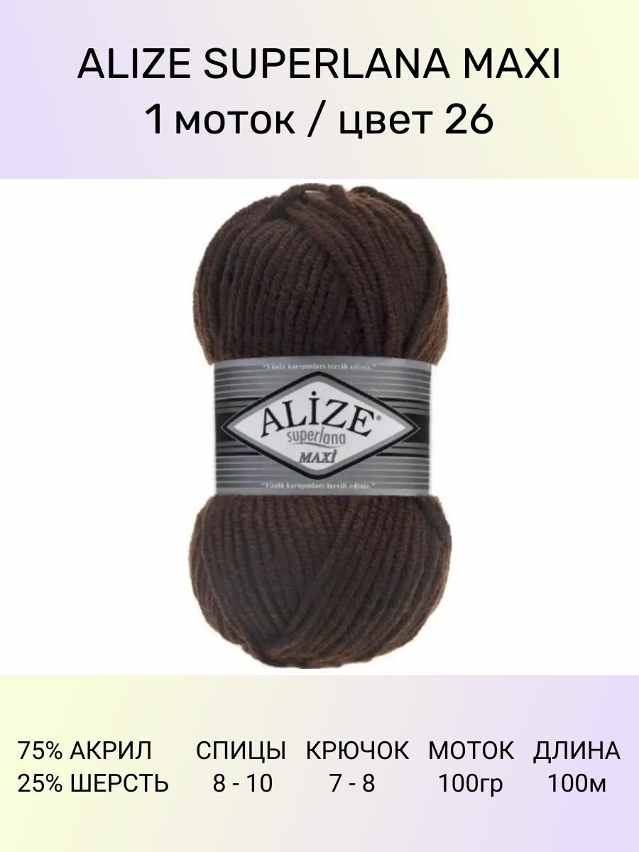 Купить Пряжа Alize Superlana Maxi коричневый (26), 25%шерсть/75%акрил, 100м, 100г, 1шт
