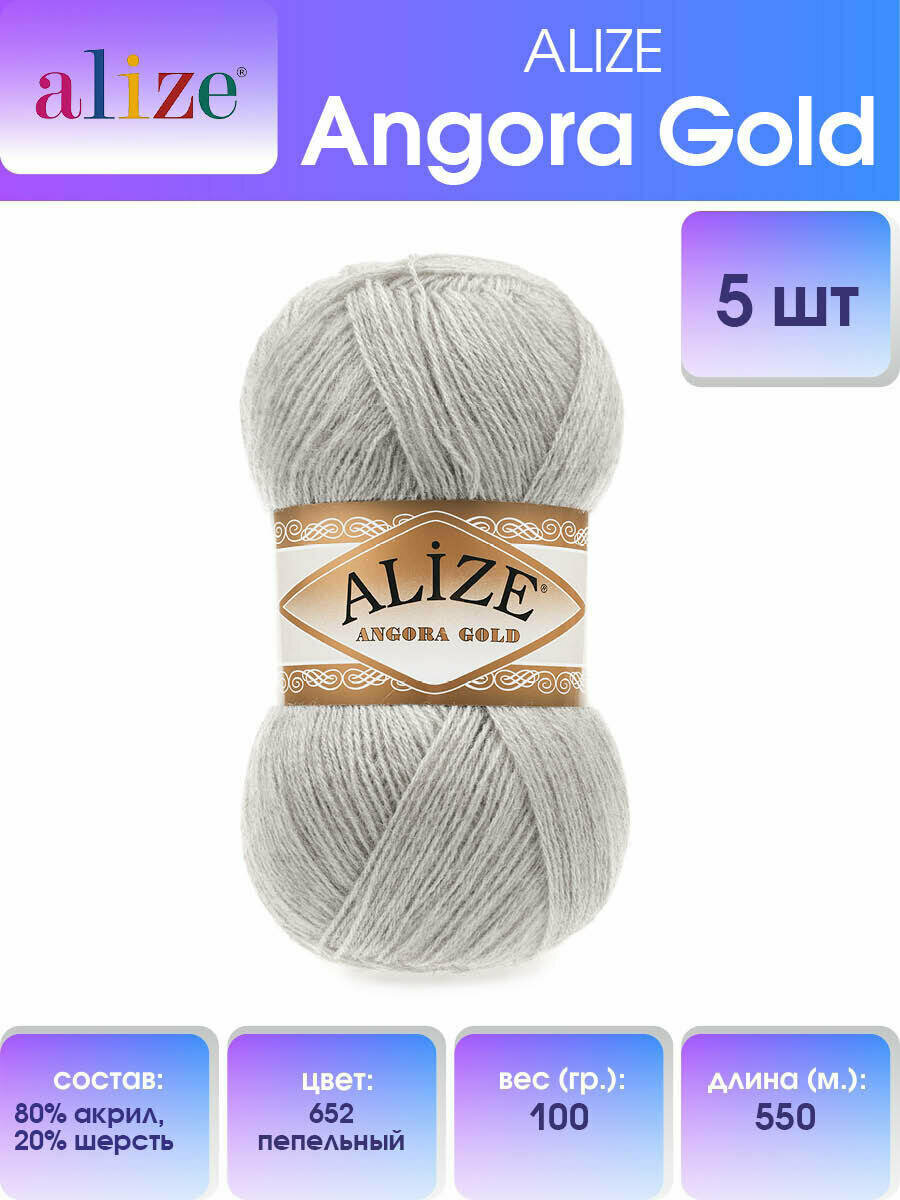 Купить Пряжа для вязания крючком, спицами Alize Ализе Angora Gold, тонкая, акрил/шерсть, цвет 652, ангора, 5 шт. по 100 г, 550 м