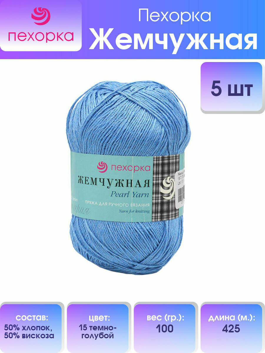 Пряжа для вязания Пехорка 'Жемчужная', 100г, 425м (50% хлопок, 50% вискоза) (15-Темно-Голубой), 5 мотков