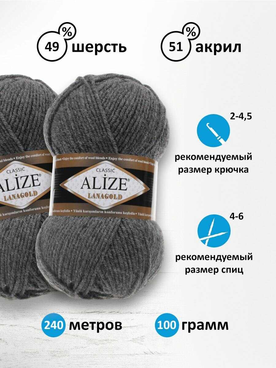 Пряжа Alize Lanagold Темно-серый (348) 2 мотка 100 г/240 м (49% шерсть, 51% акрил) ализе ланаголд