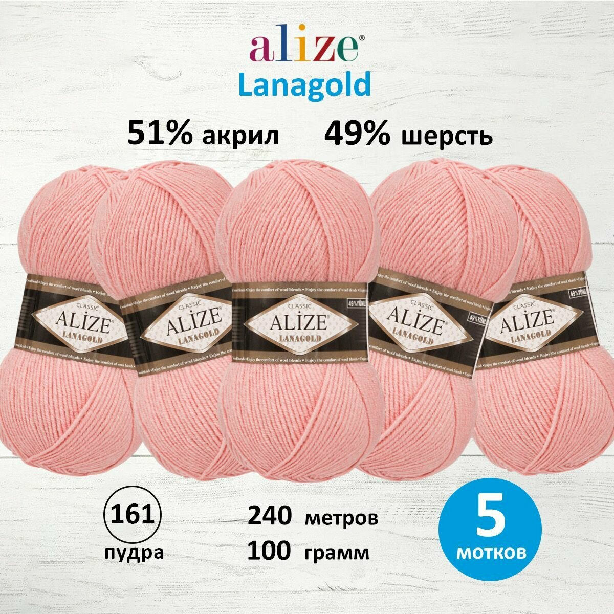 Купить Пряжа для вязания ALIZE 'Lanagold', 100г, 240м (49% шерсть, 51% акрил) (161 пудра), 5 мотков