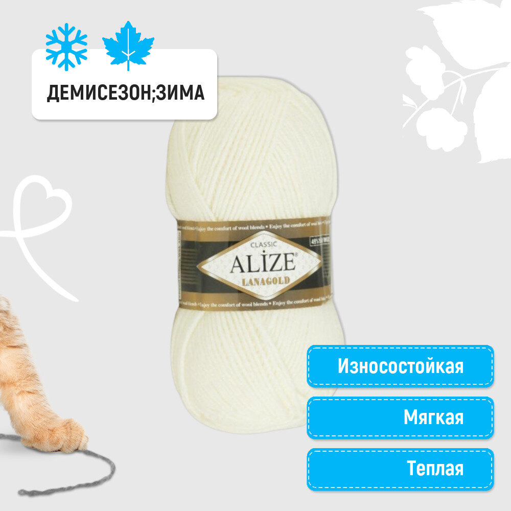 Пряжа Alize Lanagold (Ланаголд) цвет кремовый 01, 49% шерсть, 51% акрил 100г 240м 5шт.