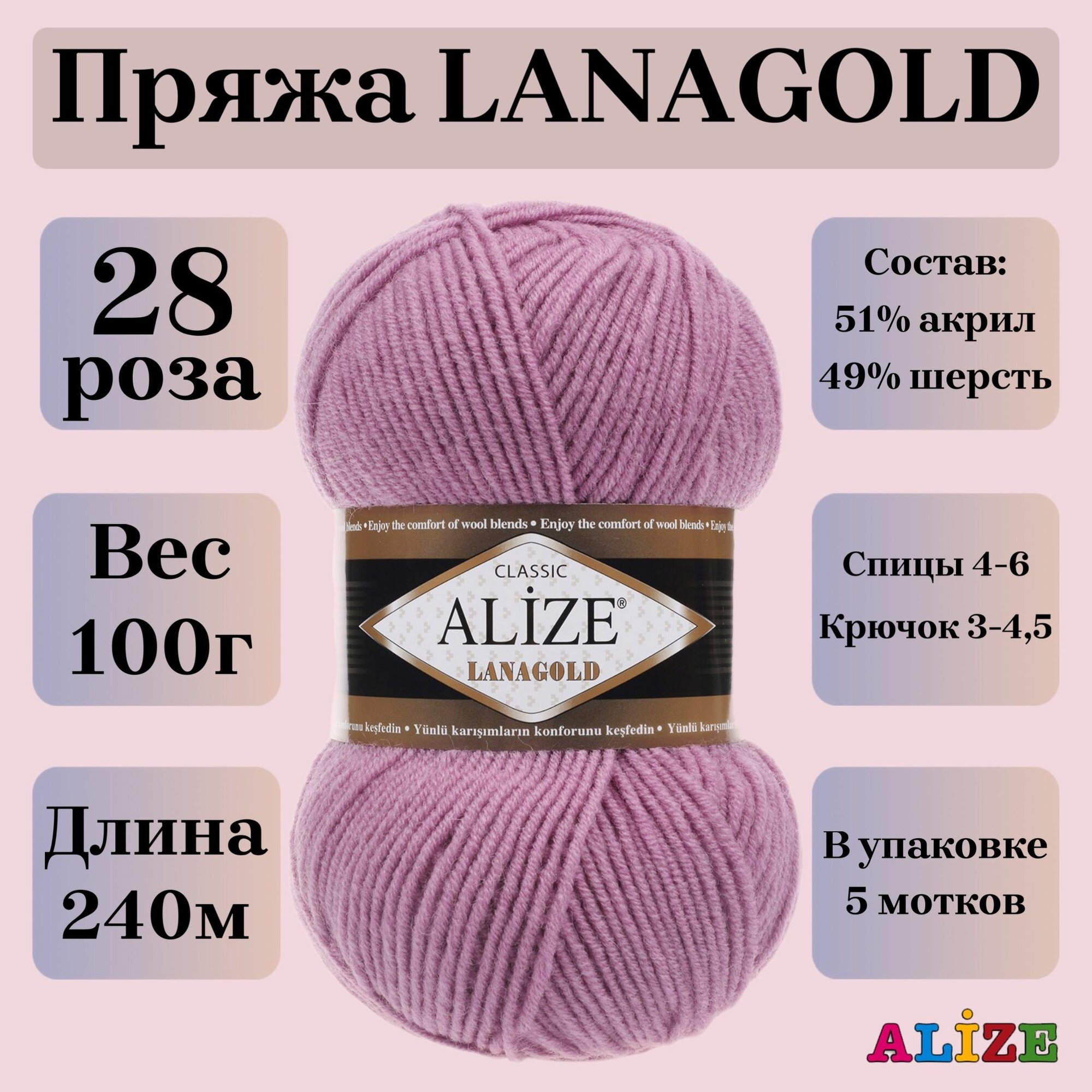 Пряжа Alize Lanagold (Ланаголд) - 1 моток Цвет: 28 роза 49% шерсть, 51% акрил 100г 240м