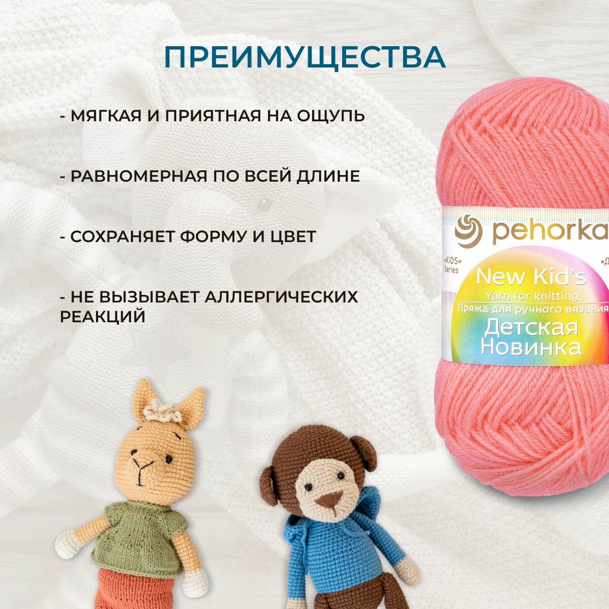 Пряжа Пехорка Детская новинка, 100% акрил высокообъемный, 50г 200м, 5шт, 324 светлая азалия