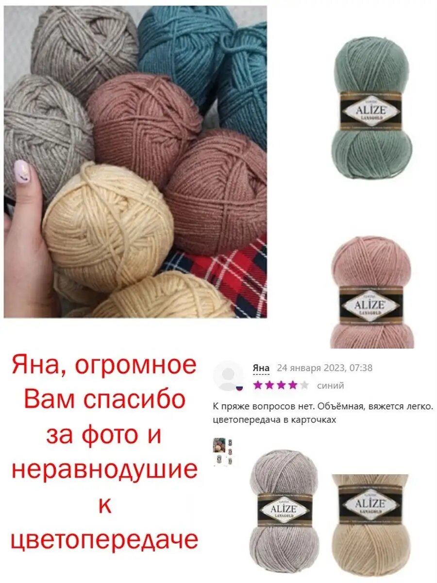| Отзыв: | Отличная цена, цвет, как я хотела. Вяжу из такой пряжи давно, очень нравится. |