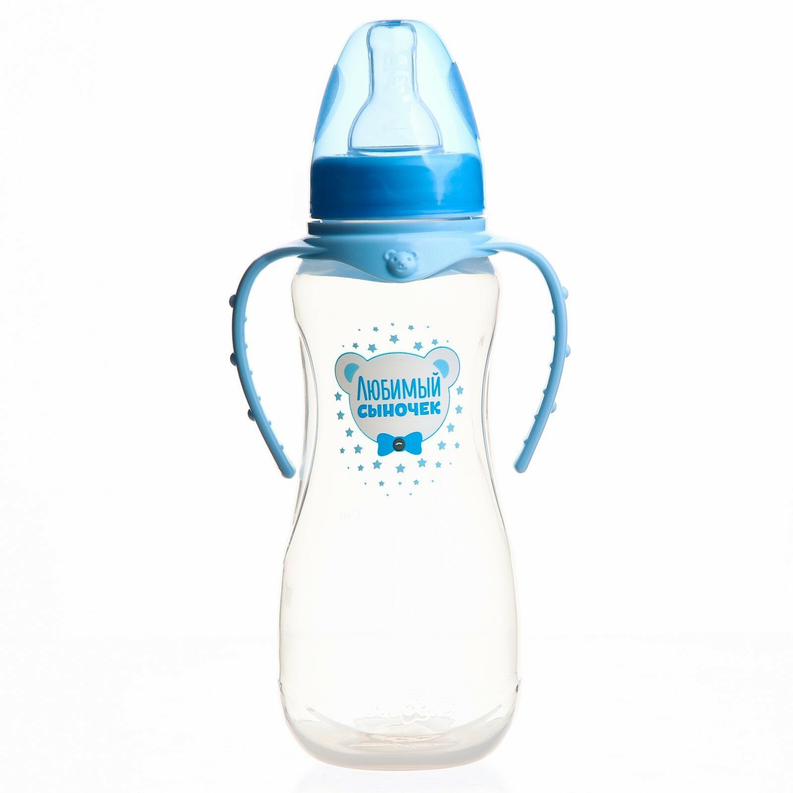Купить Бутылочка для кормления малыша "Любимый сыночек", классическое горло, с ручками, от 0 мес., 250 мл, приталенная, цвет голубой