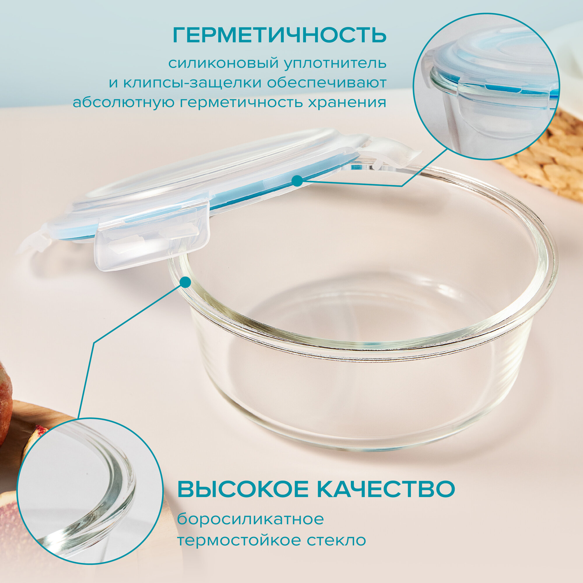 Контейнер объемом 1500 мл из жаропрочного стекла с герметичной крышкой из пластика