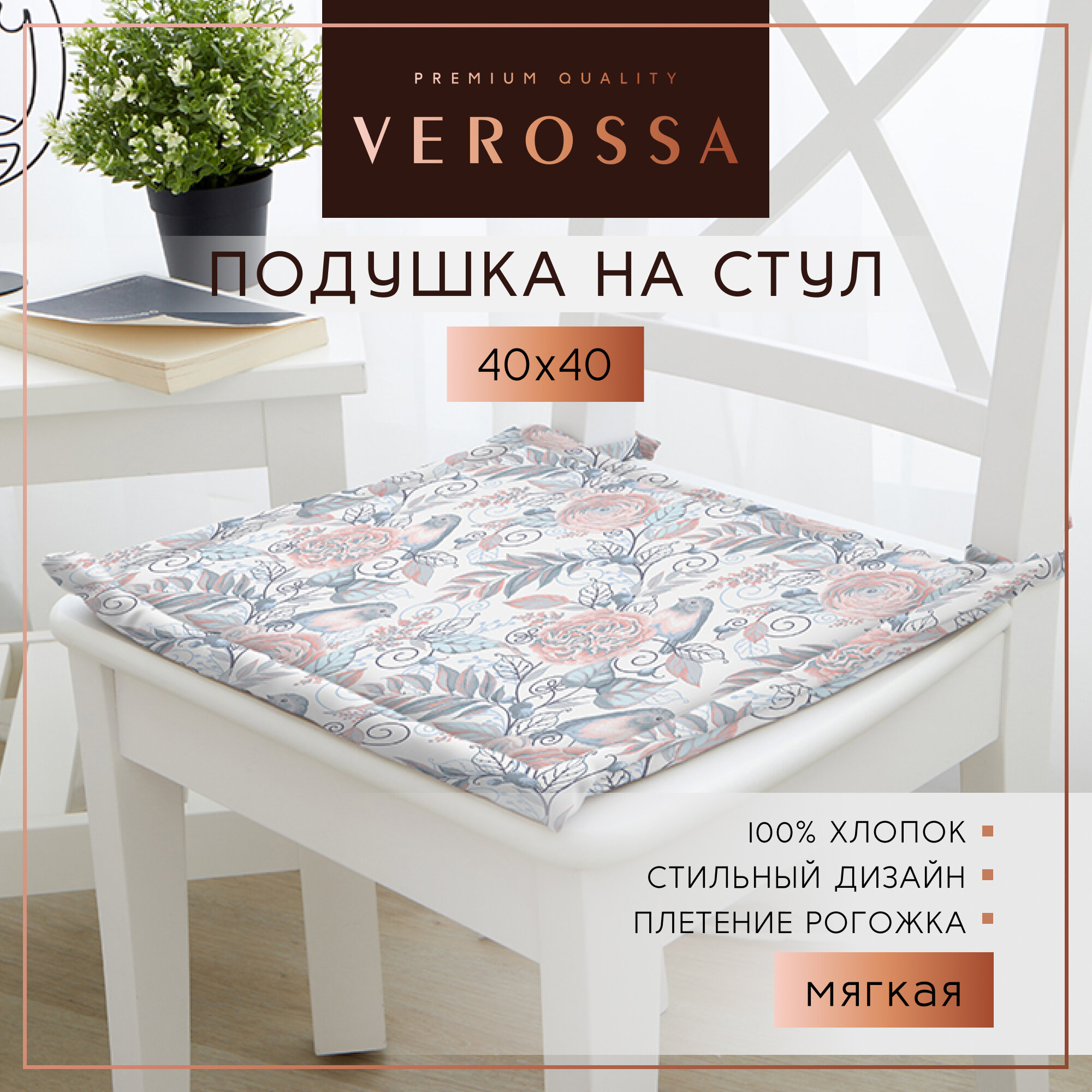 Подушка на стул с завязками 40х40 см Verossa - 1 шт., хлопок 100%