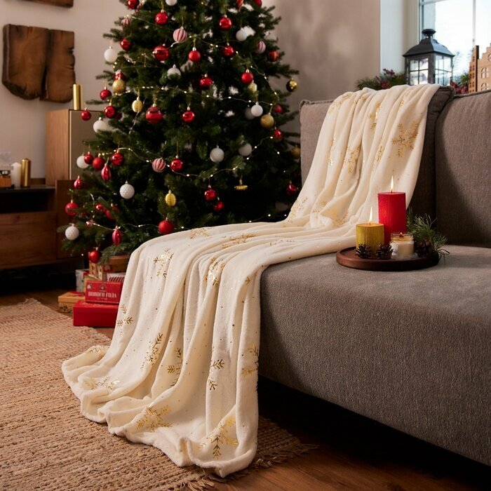 Плед Этель «Золотые снежинки», белый, 180х200 см, корал-флис