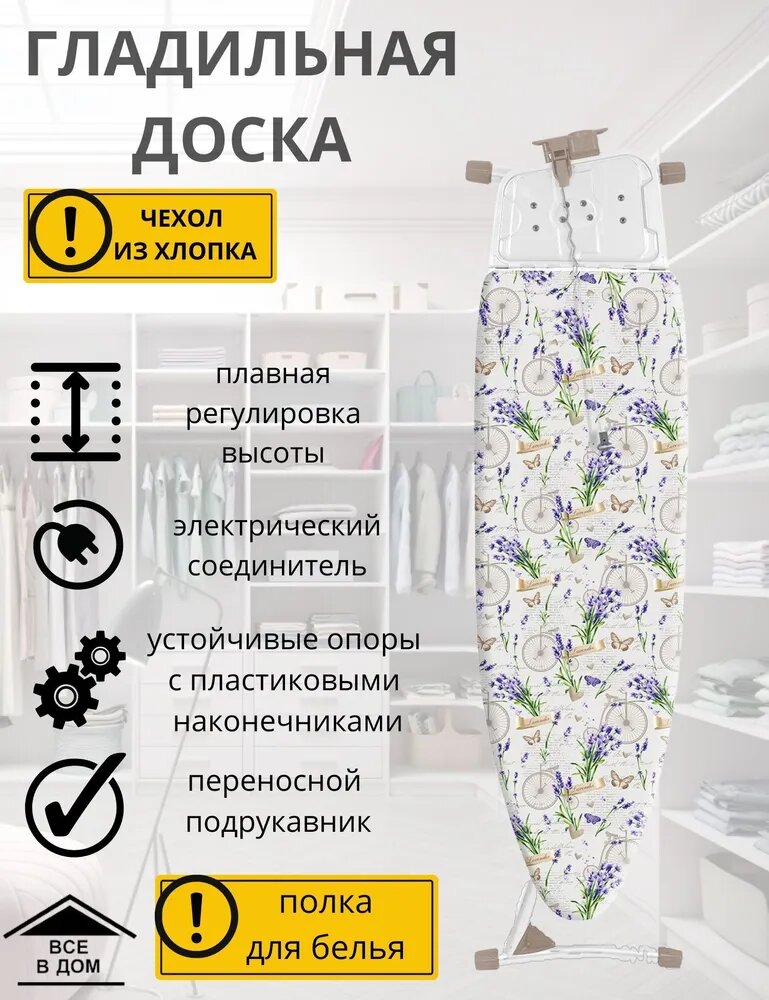 Гладильная доска с плавной регулировкой по высоте, полкой для белья, съемным подрукавником, розеткой, 122х40 см, НГ/1