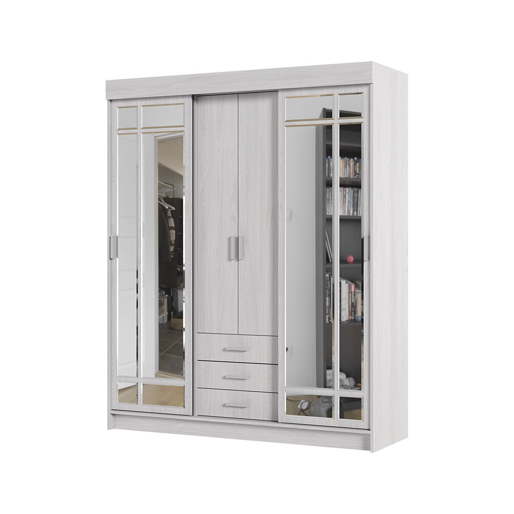 Шкаф распашной Симба 3х створчатый с зеркалом, Белый глянец/Дуб Белфорт