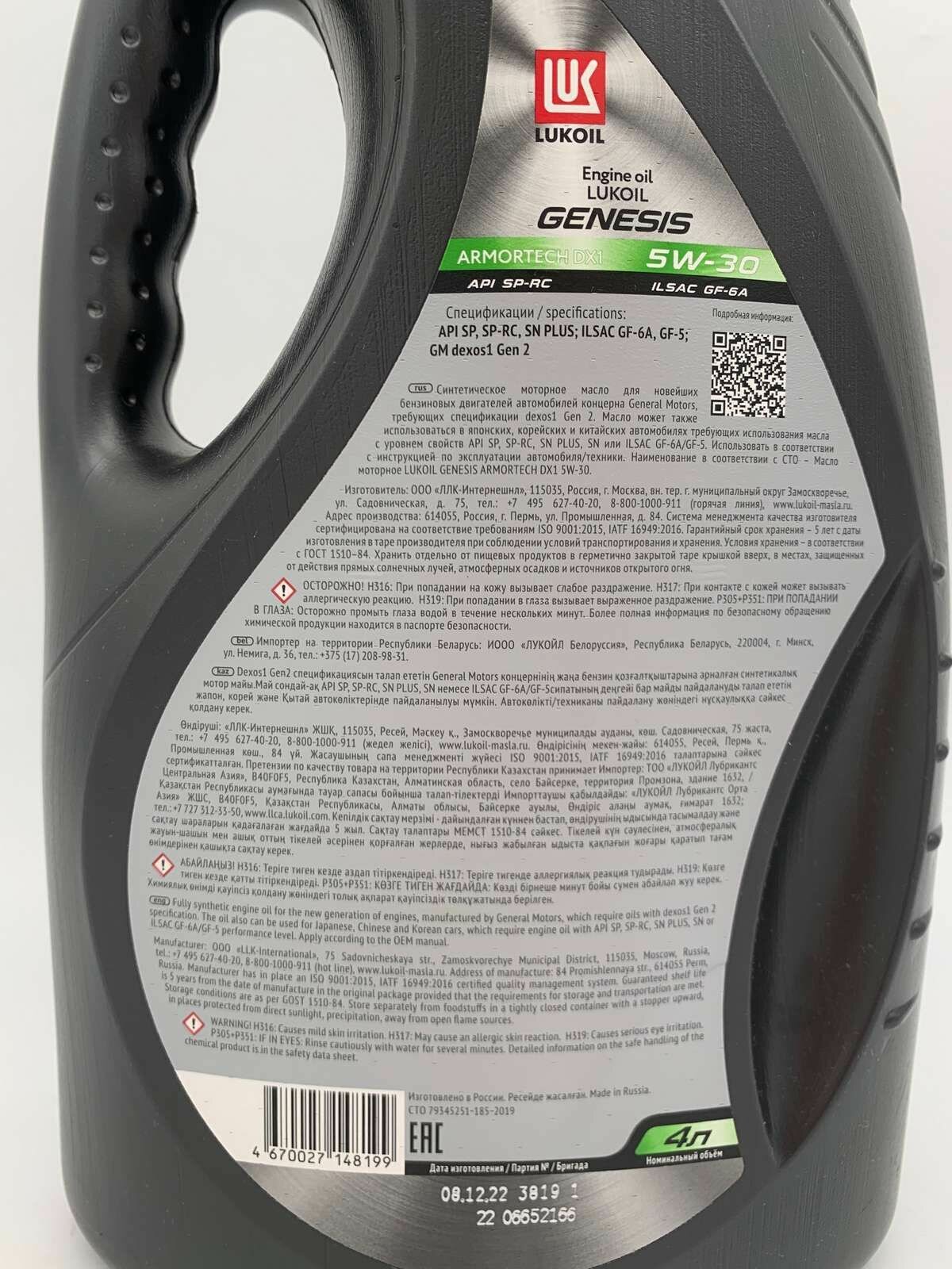 Масло лукойл 5w30 genesis armortech dx1 api sp/sp-rc/sn plus 4л син