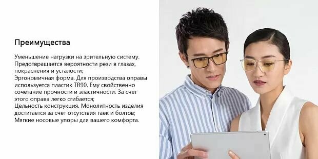 | Минусы: | Конструкция хлипкая на первый взгляд, но по факту, если их не бросать на стол и не крутить за ушки то всё хорошо. Из-за цвета линз меняется цвет( но это не собо важный критерий, если вам не важны цвета, а просто работает за офисными программами) |