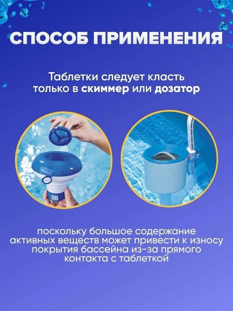 | Плюсы: | Отличная химия для бассейна. Для регулярной работы водоочистки кидаю по 3-4 таблетки. Мой бассейн круглый 4,5 м. глубина 1,5 м. |