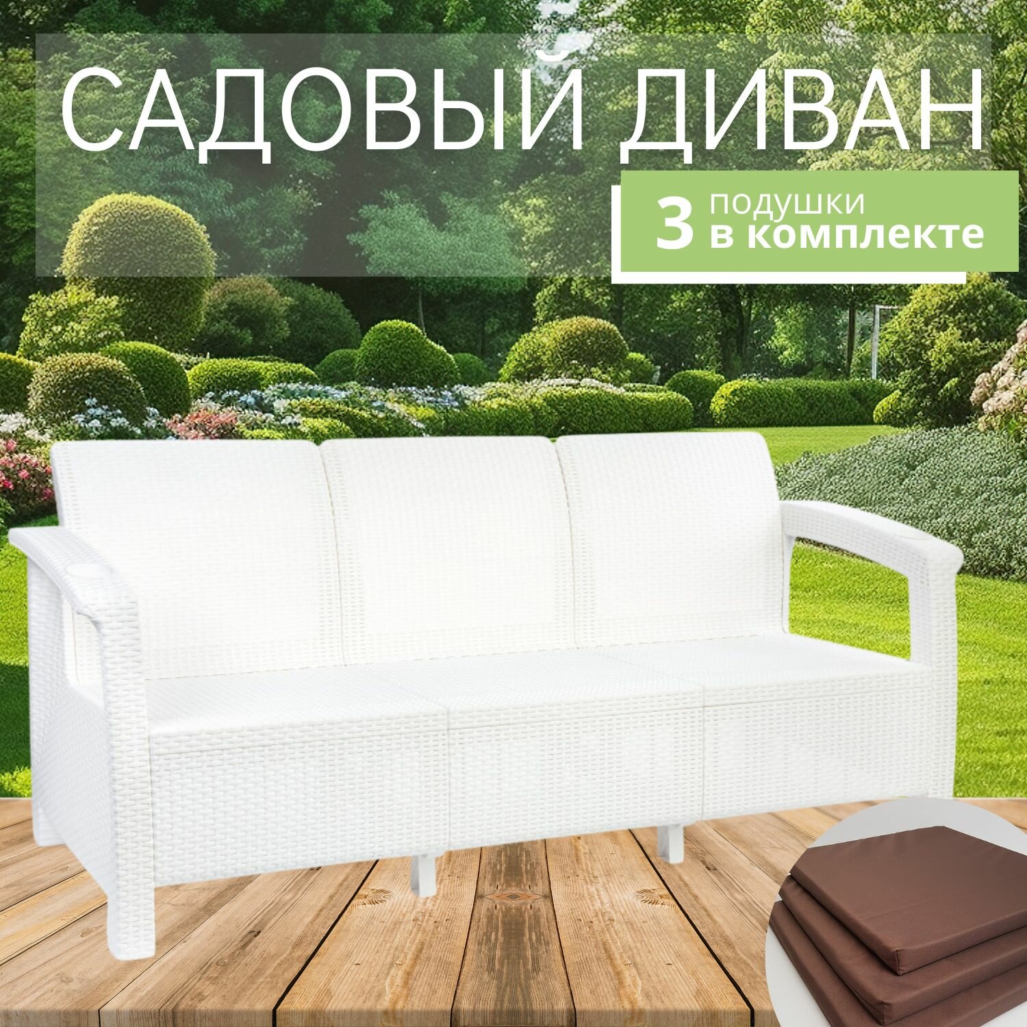 СохранитьДиван садовый, 3-х местный, 188х70х79 см, белый (с коричневыми подушками) интересное: