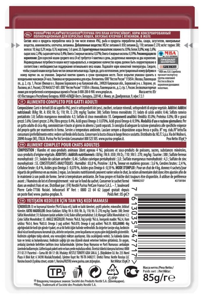 Pro Plan Nutrisavour Adult пауч для взрослых кошек (кусочки в желе) Ягненок, 85 г. упаковка 26 шт