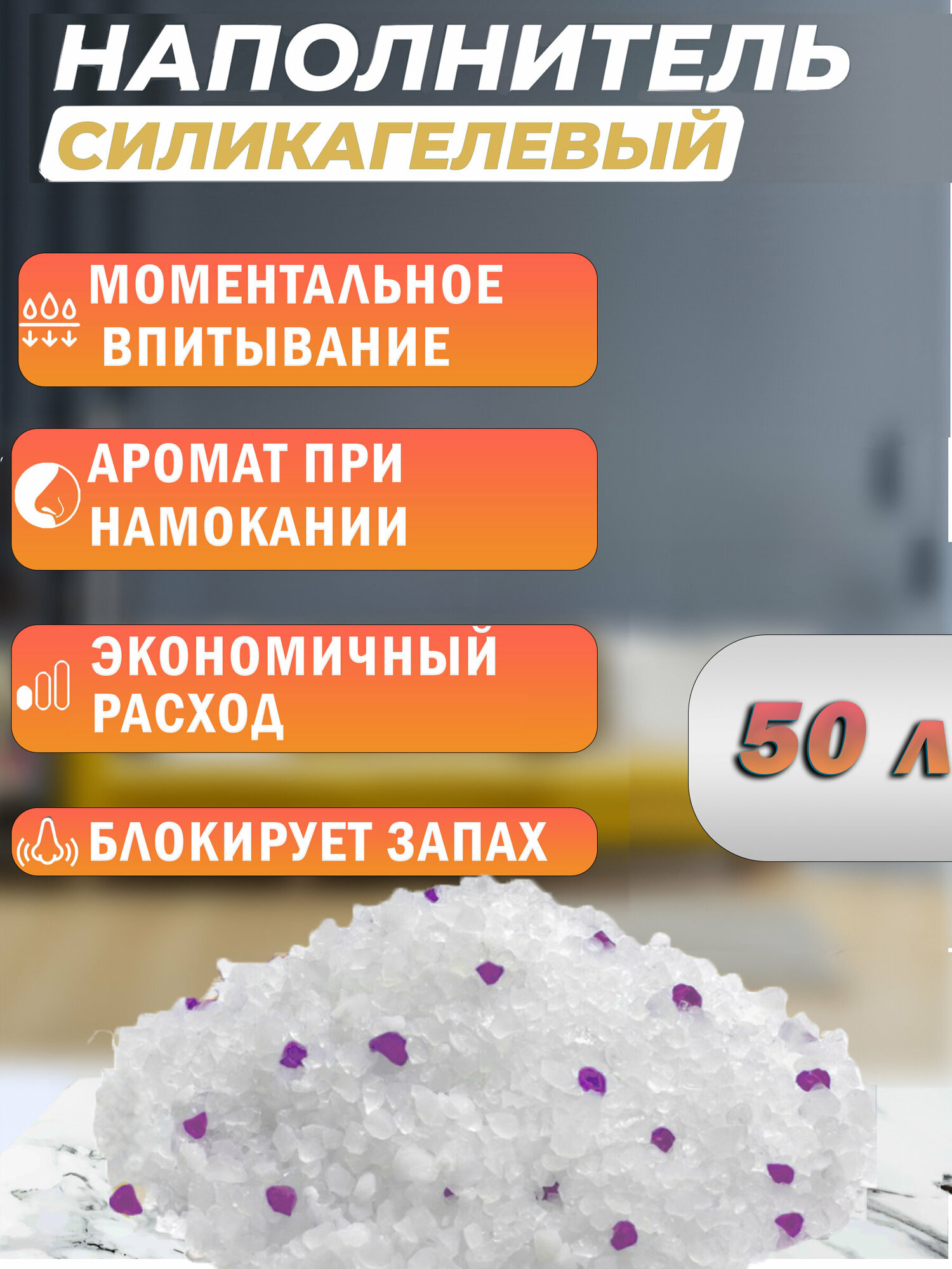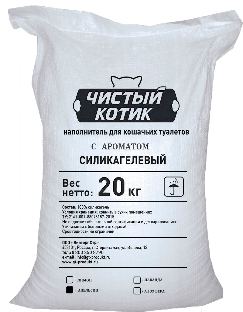 Купить Наполнитель впитывающий силикагелевый Чистый котик колотый с ароматом Апельсина 20кг/50 л
