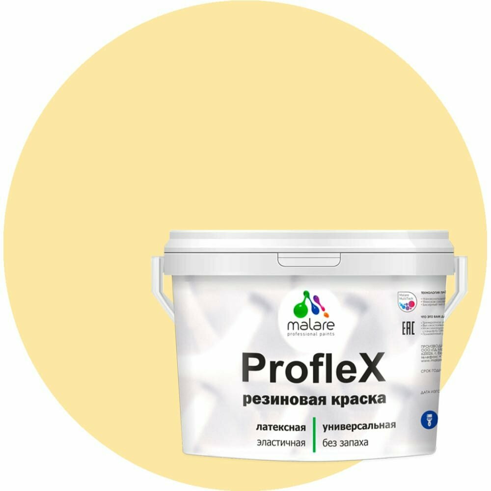 Краска резиновая Malare ProfleX для фасадов, интерьера, мебели, кровли, цоколей, универсальная, эластичная моющаяся, быстросохнущая, без запаха, матовая, cпелый лимон, 2 кг.