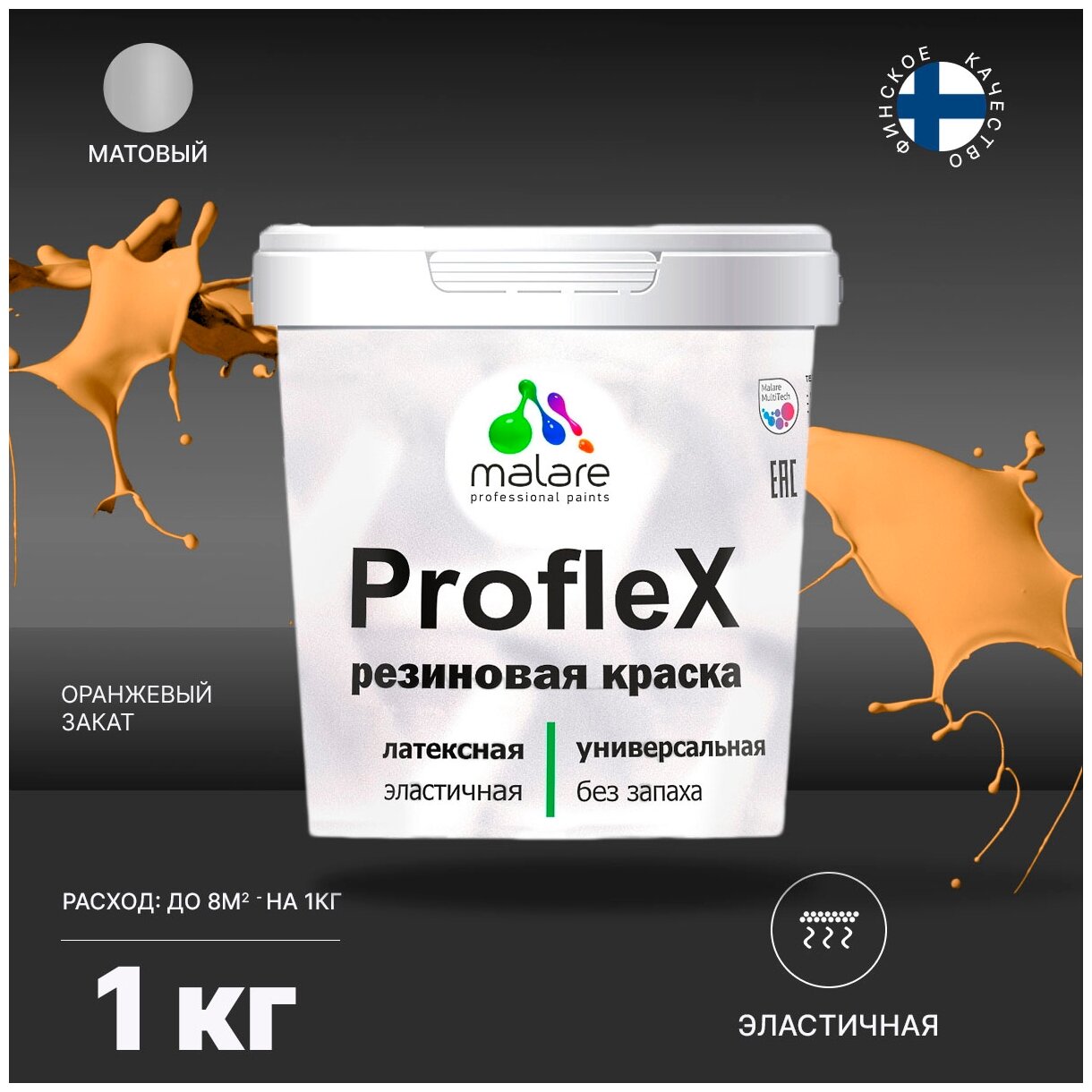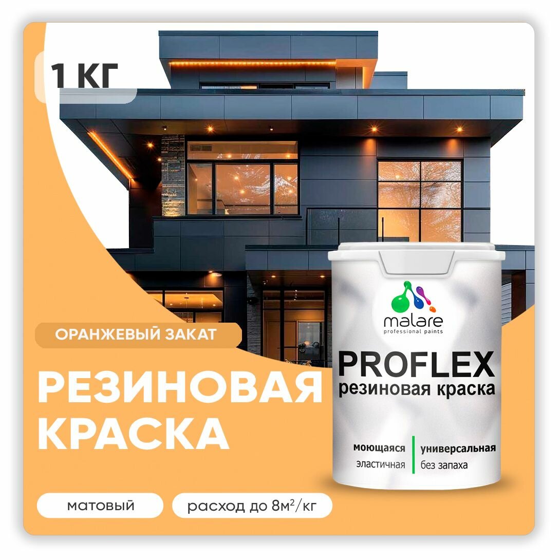 Краска резиновая Malare ProfleX для фасадов, интерьера, мебели, кровли, цоколей, универсальная, эластичная моющаяся, быстросохнущая, без запаха, матовая, оранжевый закат, 1 кг.
