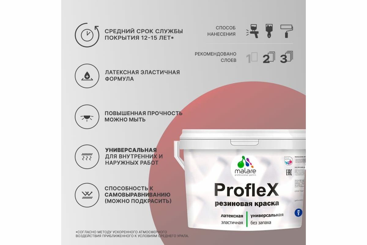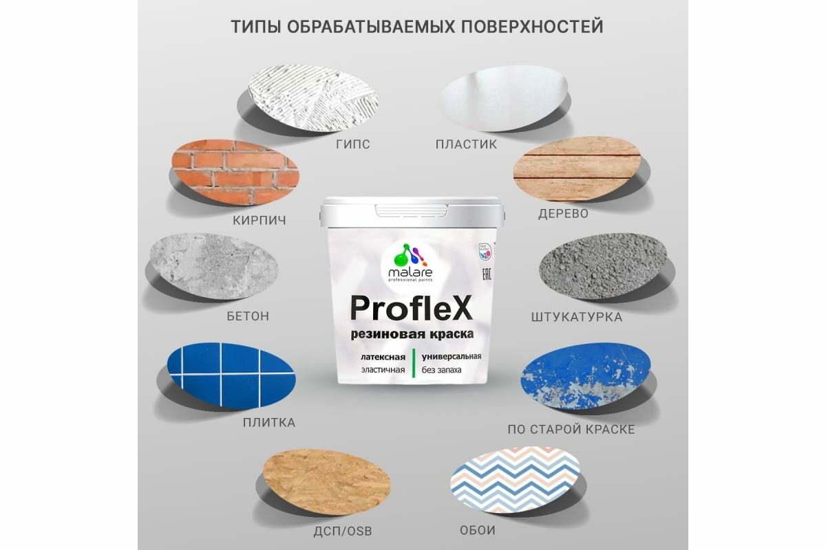 Краска резиновая Malare ProfleX для фасадов, интерьера, мебели, кровли, цоколей, универсальная, эластичная моющаяся, быстросохнущая, без запаха, матовая, светло-серый, 1 кг.