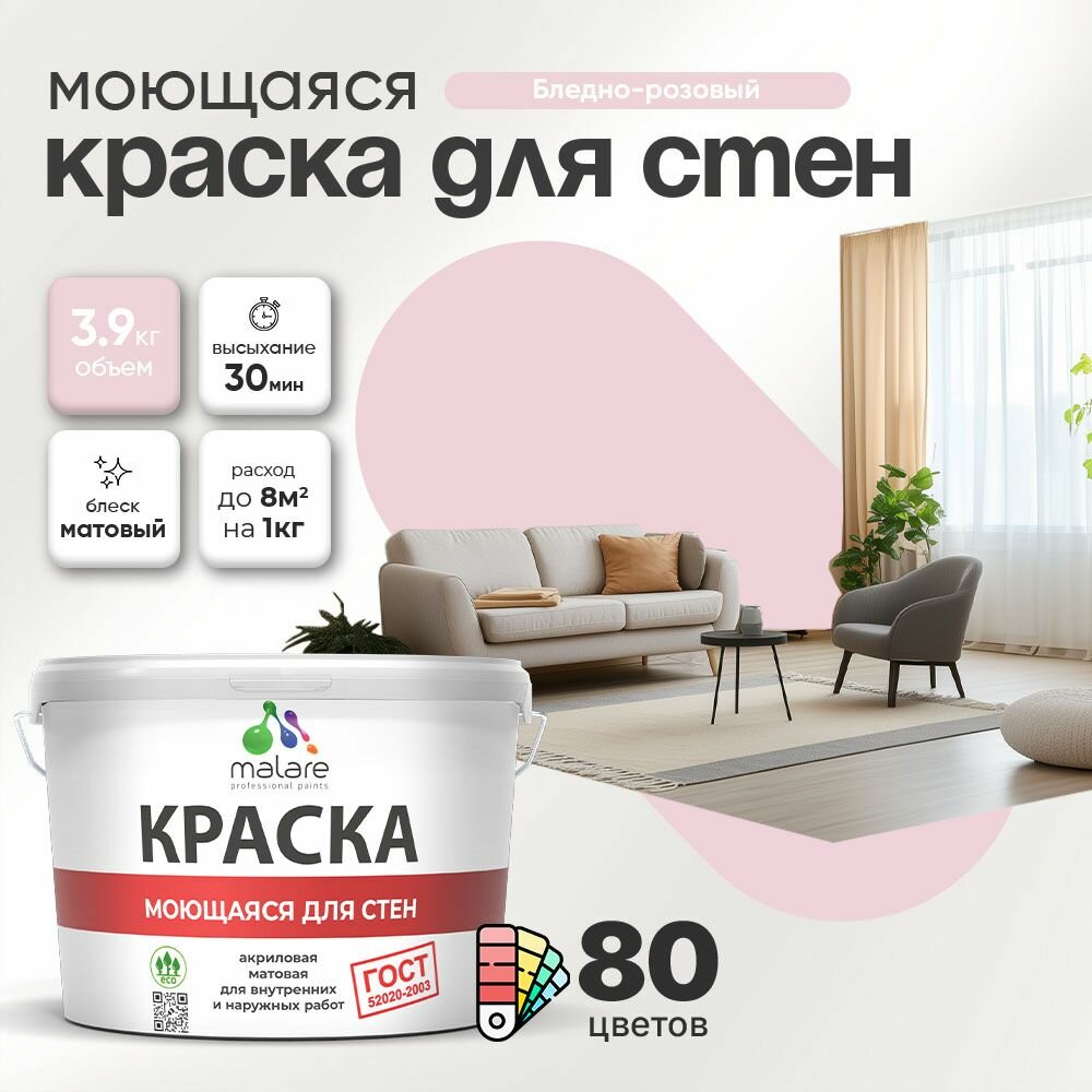 Моющаяся акриловая Краска Malare "ГОСТ" для стен и обоев, для потолка, универсальная для внутренних и наружных работ, быстросохнущая без запаха, матовая, бледно-розовый, (1л - 1.3кг)