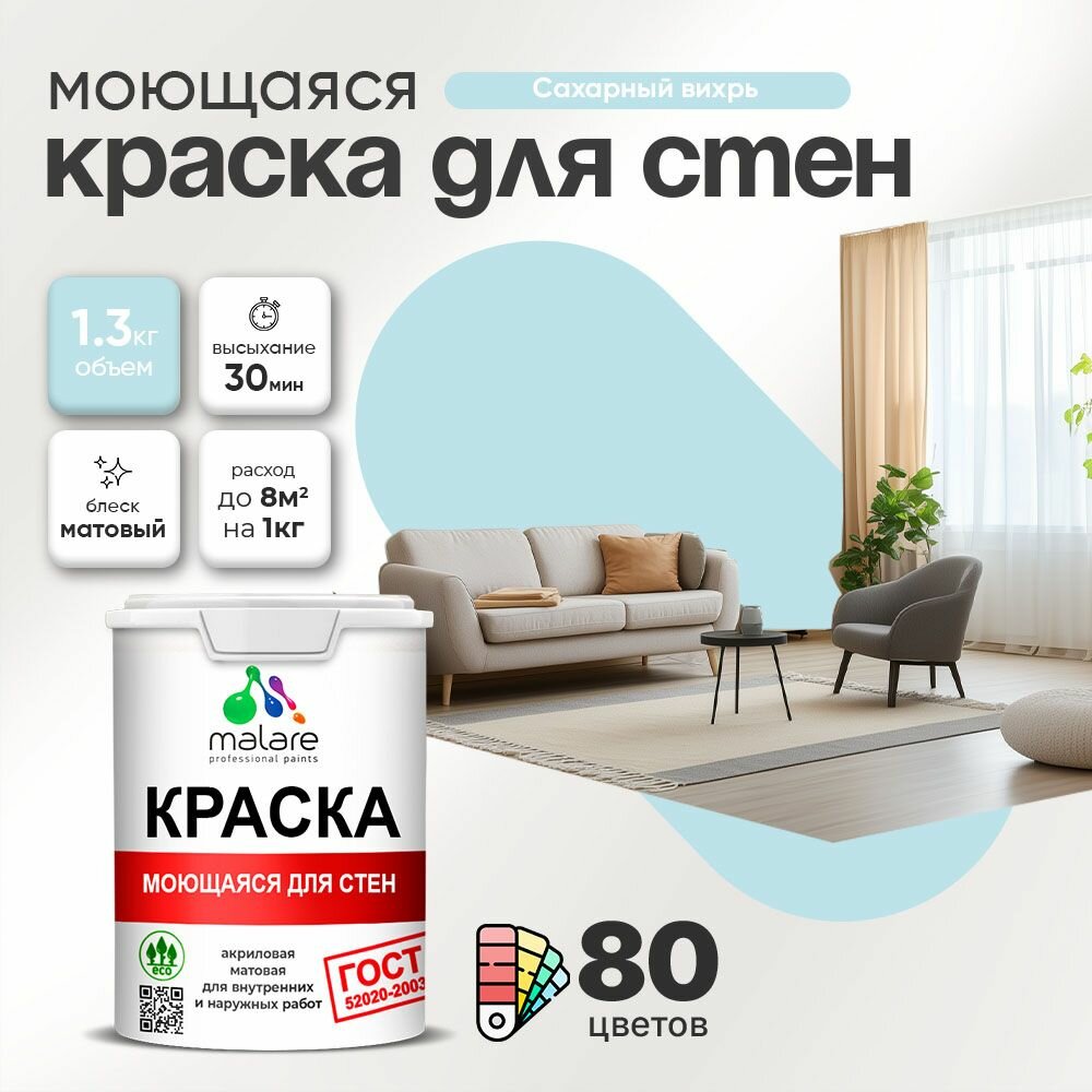 Моющаяся акриловая Краска Malare "ГОСТ" для стен и обоев, для потолка, универсальная для внутренних и наружных работ, быстросохнущая без запаха, матовая, летний бриз, (1л - 1.3кг)