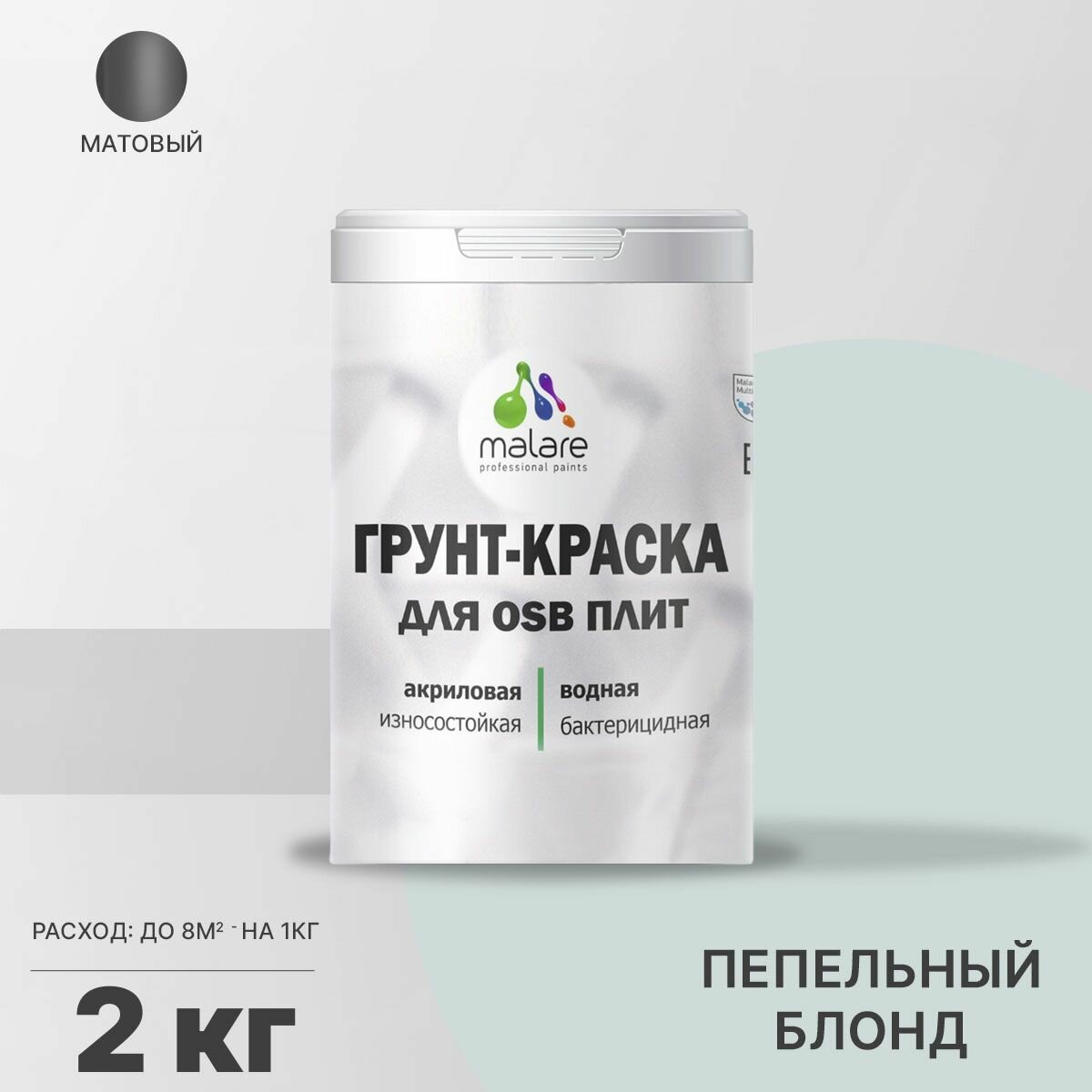 Краска Malare для OSB плит, деревянных и минеральных поверхностей, фасадная, интерьерная, универсальная, с антисептическим эффектом, быстросохнущая, без запаха, матовая, светло-серый, 2 кг.