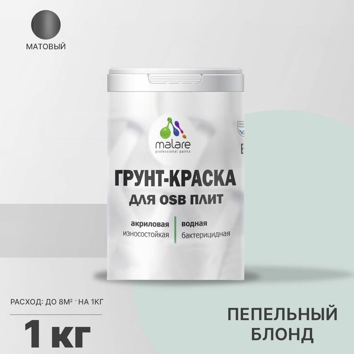 Краска Malare для OSB плит, деревянных и минеральных поверхностей, фасадная, интерьерная, универсальная, с антисептическим эффектом, быстросохнущая, без запаха, матовая, светло-серый, 1 кг.