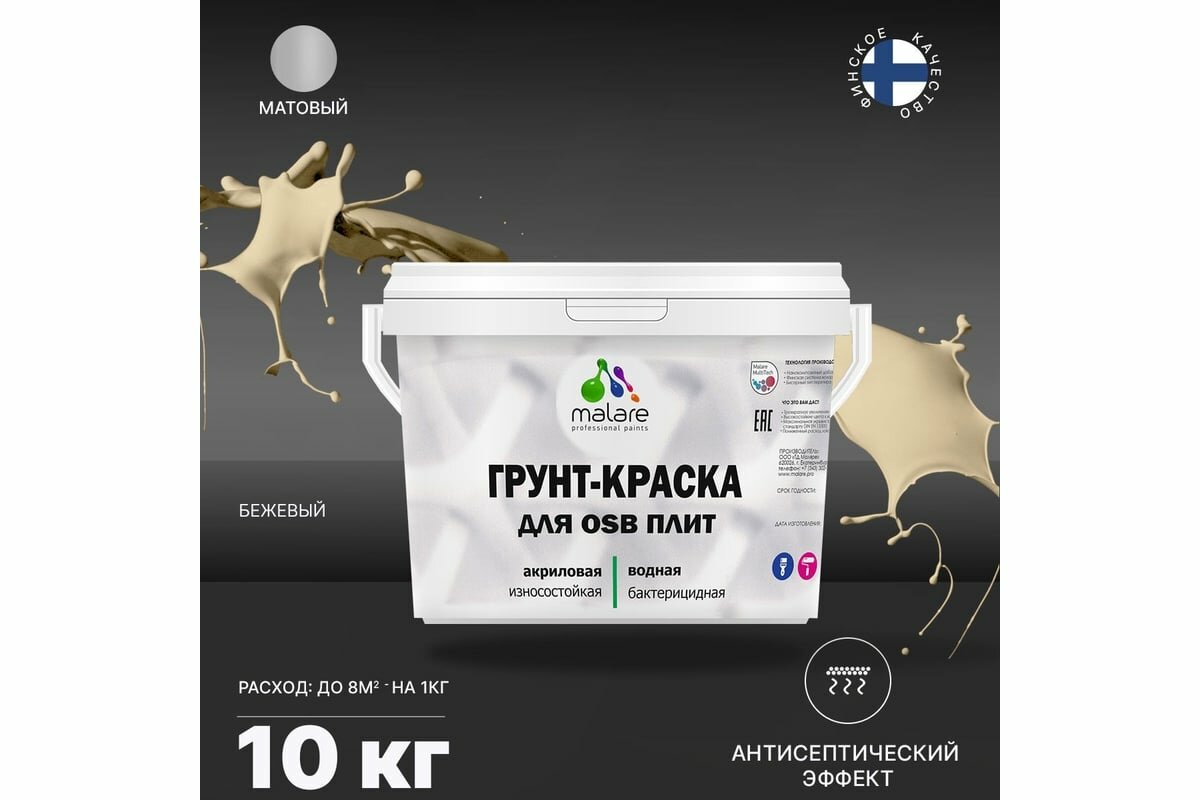 Краска Malare для OSB плит, деревянных и минеральных поверхностей, фасадная, интерьерная, универсальная, с антисептическим эффектом, быстросохнущая, без запаха, матовая, бежевый, 1 кг.