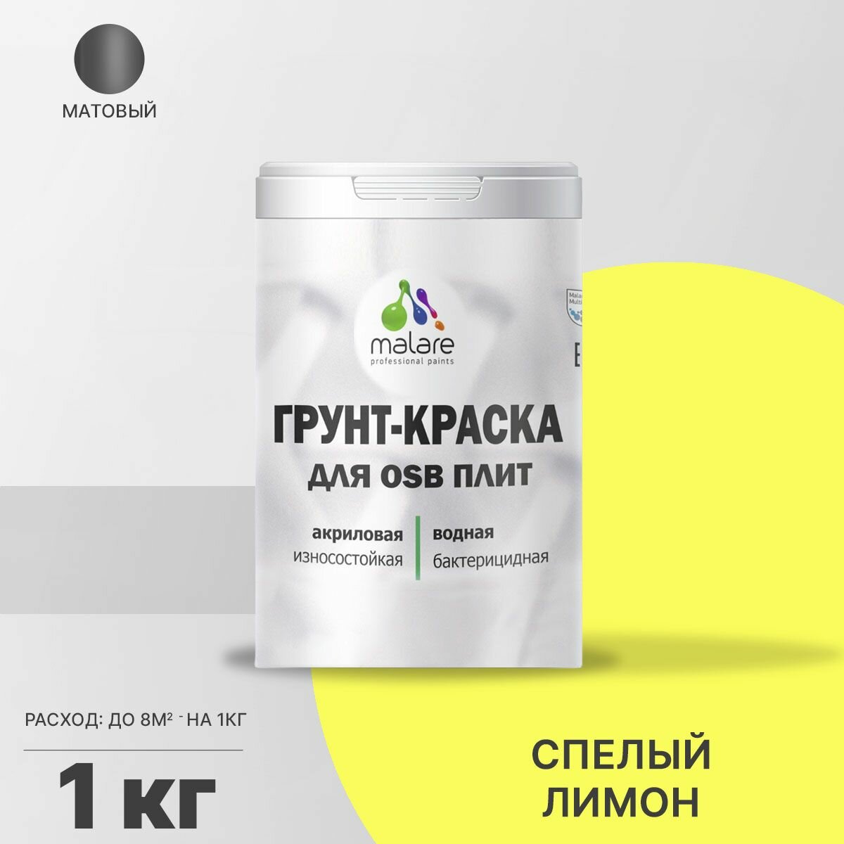 Краска Malare для OSB плит, деревянных и минеральных поверхностей, фасадная, интерьерная, универсальная, с антисептическим эффектом, быстросохнущая, без запаха, матовая, cпелый лимон, 1 кг.