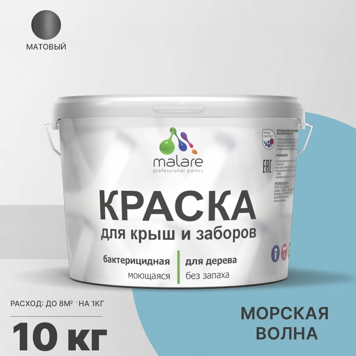 Краска Malare для деревянного забора, для крыши из шифера, для деревянных и минеральных поверхностей, с антисептическим эффектом, быстросохнущая, без запаха, матовая, морская волна, 1 кг.
