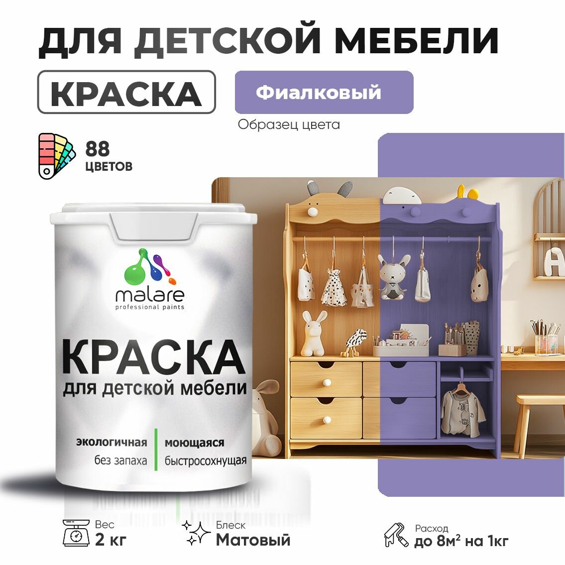 Купить Акриловая краска Malare для детской мебели для кухонных фасадов, мебели из дерева, моющаяся, быстросохнущая без запаха матовая, фиалковый, 2 кг.