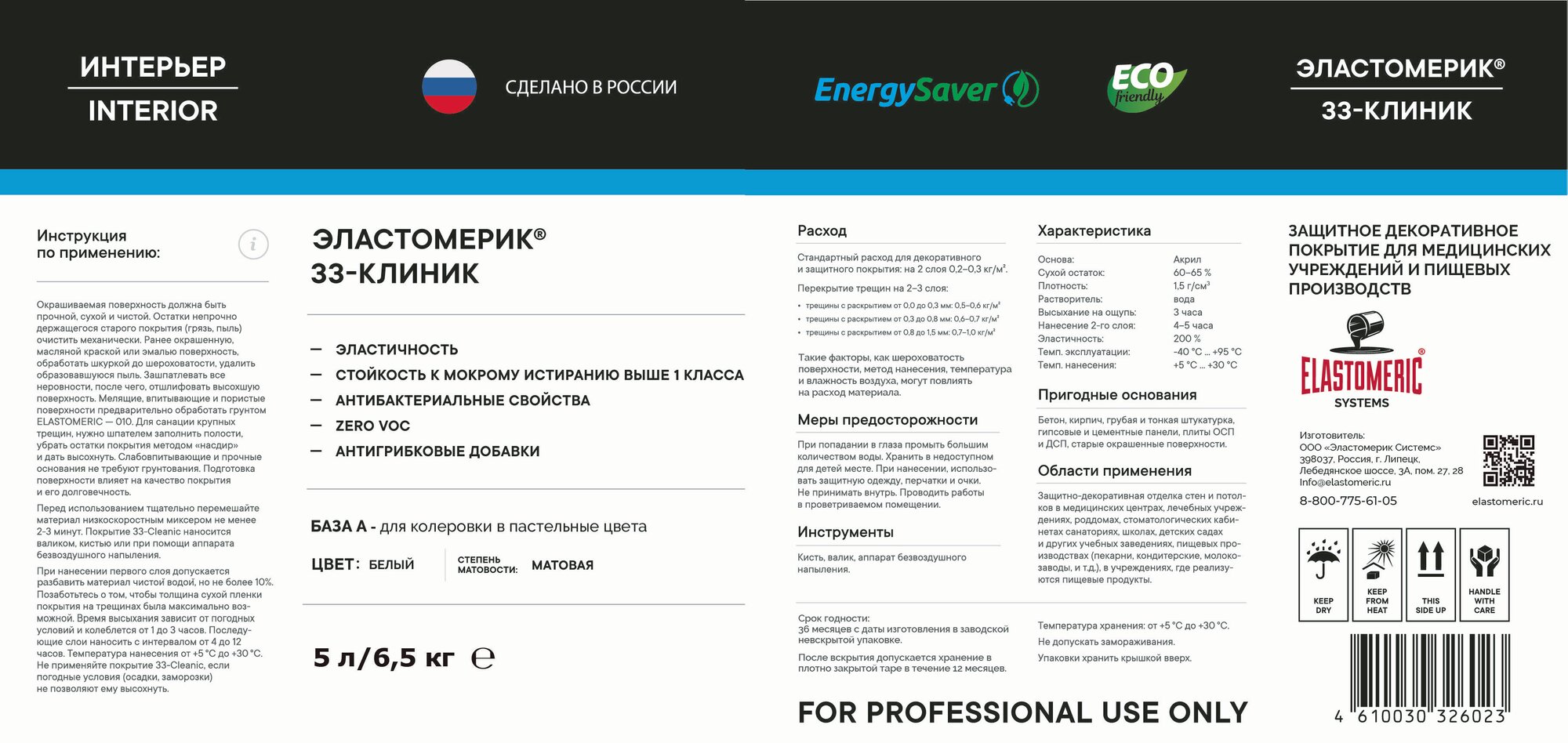 Краска для медицинских учреждений ELASTOMERIC 33-CLEANIC/база A (5 литров)